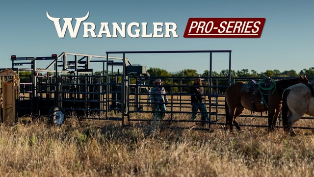 One person can set up the Wrangler Portable Corral in about ten minutes ready to contain 150-400 head of cattle without lifting a panel. The self contained system easily pulls down the highway at the speed limit and fits thru any gate your pickup will. Works on extremely uneven terrain. Over 20 different corral configurations are possible. Wheels on each panel and a electric over hydraulic jack eliminate lifting and saves time. Includes frame gates for sorting. And now comes standard with a solar power charging unit so you battery is being charged whether it's at the farm or in the field. Patent Pending