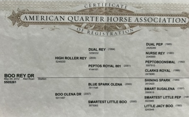 Boo Rey DR is a 2012 Red Roan Stallion by High Roller Rey who was a 2012 NRCHA Open Futurity Finalist (Dual Pep x Peptos Royal 001) and out of Boo Olena DR (Blue Spark Olena x Smartest Little Boo). High Roller Rey has earned $51,018: finalist in the NRCHA Open Futurity; split 4th, NRCHA Open Stakes (Herd Work Reserve Champion); finalist in the NRCHA Open Derby (Champion of the Preliminary Herd Work), NRCHA Open Stakes (Champion of the Preliminary Fence Work), NRCHA Open Hackamore Classic; Utah Open Derby Champion twice; Finalist in the Idaho RCHA Derby Open.