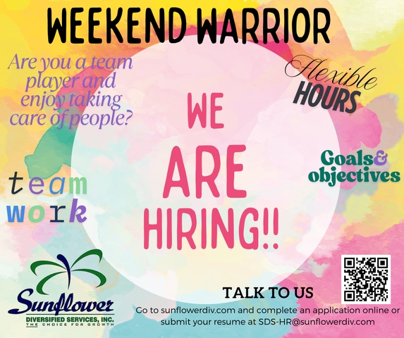 Sunflower Diversified Services is hiring and we need you!! Full-time, mid-time, part-time available options. Weekend warriors like to dedicate their weekends to work and play during the week with their personal time. You can come to work Friday evening, spend the night and get paid to sleep, work all day Saturday, get paid to sleep, work Sunday, get paid to sleep, and wake up ready to start your week on Monday. We offer flexible schedules to meet your hours of availability. Maybe you can only work 5 to 10 hours a week? Or maybe you can work full time with the opportunity for overtime? Weekends only? A few hours each evening? Come and talk to us! New hires earn a $200 training bonus for attending & completing paid training. This position may be eligible for a hiring bonus of up to $1500 after successful completion of six months of employment. Check out our Facebook page for a full list of open positions