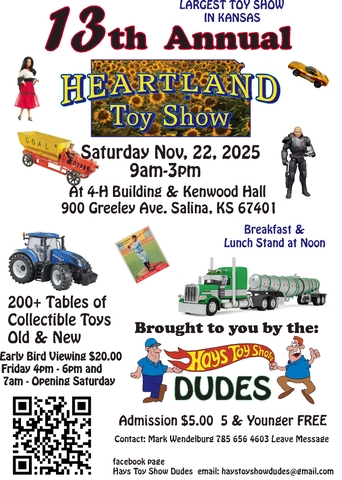 Heartland Toy Show will be Saturday November 22, 2025. Open 9am - 3pm. At the 4H building & Kenwood Hall, 900 Greeley Ave. Salina, KS. A huge variety of venders will be selling Toy/Collectible Tractors, DCP TRUCKS, Hot Wheels, Matchbox, Johnny Lightning, Model Kits, Promo Models, Transformers, Lunch Boxes, NASCAR, Trains, Dolls including Barbies, Action Figures, Ninja Turtles, 1/18 Diecast Cars, Car Ads, Trading Cards, Slot Cars, Cast Iron Toys, Tin Toys, Tonka, Buddy L, Comics, STAR WARS, STAR TREK, and much, much more. If you are a collector, Seller, Trader or just curious, we welcome you to participate. For more information, Call or text Mark Wendelburg at 785- 656 4603 ALSO you may Contact us at Hays Toy Show Dudes on facebook or email: haystoyshowdudes@gmail.com Thank You Again to the Vendors, and to all our patrons over the past years!