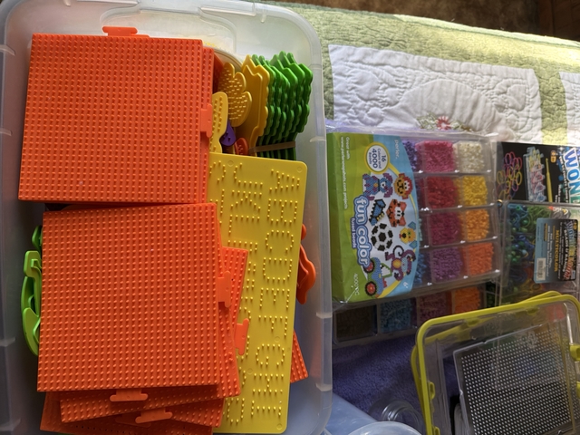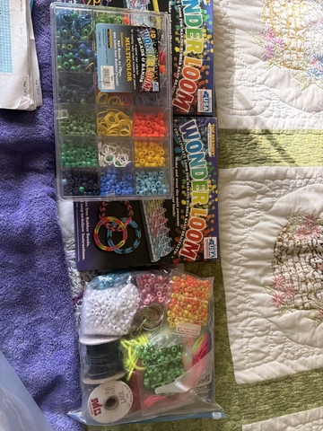 Perler beads , peg boards, paper, plus lots of supplies. Some new beads still in packages Plus wonder looms and beads and patterns $30 Shelves included