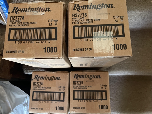 Remington 9MM ammo, 115 grain, FMJ, reloadable, brass cased, you must buy 1000 rounds (a full case, 20 boxes of 50 rounds each) to get this price, cash only, no trades, message if interested. New, fresh production ammo in factory sealed cases. 265.00 out the door, no add-ons.