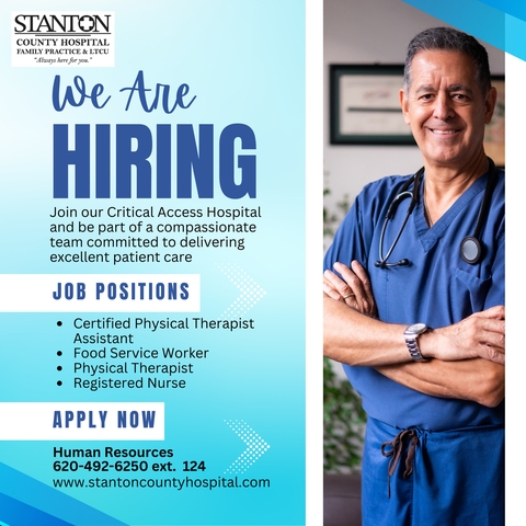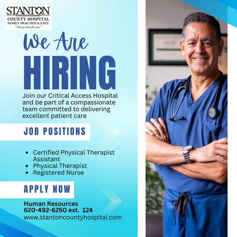 For more information please contact Human Resources at 620-492-6250 ext. 124 or applications are available at the admitting office at the hospital located at 404 N Chestnut, Johnson or apply online at: https://recruiting.paylocity.com/recruiting/jobs/All/300d27f4-ee33-4e11-a923-127fe2282150/Stanton-County-Hospital
