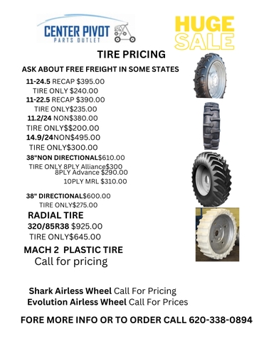 HERE IS PRICING ON TIRE PRICES FOR CENTERPIVOT. MOST OF THESE TIRES AND WHEEL ARE FREIGHT FREE. FOR MORE INFO CALL 620-338-0894