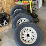 11x38 on 9 lug wheels, weather checked but hold air. Five total $1000