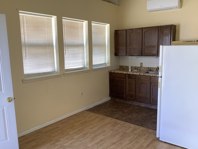 Comes with stove and fridge. Lots of cabinets in the kitchen area. NO washer or dryer and no room for either of them.