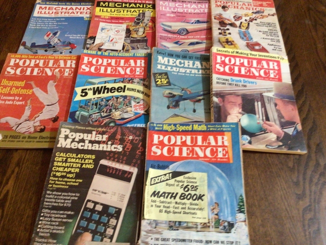 Popular Science and Popular Mechanics and Mechanix Illustrated magazines from the 1950s 60s and 70s. All in good condition. I'll list the issues and u can look them up on eBay for more specifics for each issue. Popular Mechanics: sept 1956, dec 1958, oct 1959, nov 1966. Popular Science: January 1962, march 1962, august 1962, may 1964, July 1964, October 1964. Ten issues total. If u like cars from the 50s & 60s, these r a bargain @ $15 cash for all ten issues. No checks. No texts. Contact me here or call 6207925498 and keep trying. A no text phone. Update: Why won't these sell?🤔 So I'll lower the price to $10 💰 and add ten more issues: Popular Science, Feb 1962, Jan 1961, Mar 1961, May 1961. Popular Mechanics, Dec1971, Dec 1974. Mechanix Illustrated, Sept 1959, June 1966, Oct 1966, May 1968.