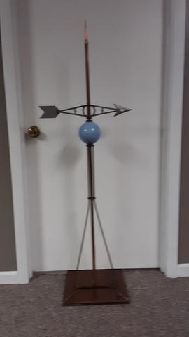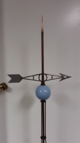 Vintage lightning rod and weather vane came off an old barn. Copper rod ,glass ball and metal stand approx 50 inches tall
