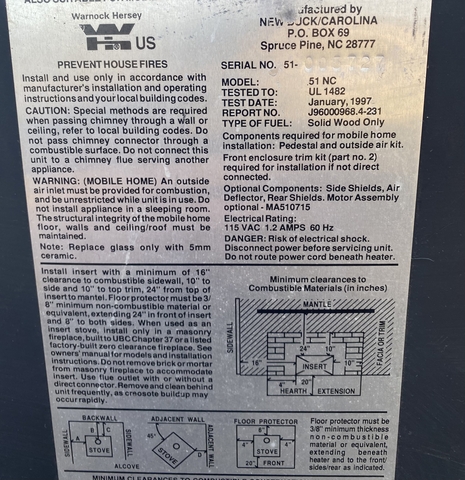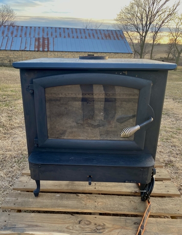 Buck woodburning wood stove, model 51, made is USA. This is a heavy woodstove but I have it strapped to a pallet and can load it on your truck or trailer with my loader. It has a glass front door so you can watch the fire like a fireplace. It is certainly a beautiful stove and I just put a fresh coat of stove polish on it. Yes, the fan works too.