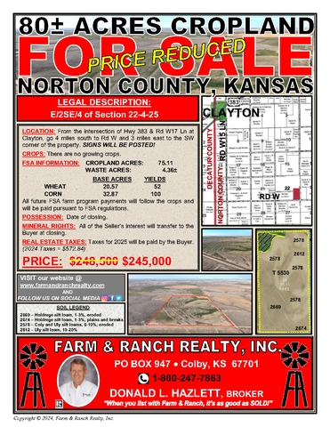LOCATION: From the intersection of Hwy 383 & Rd W17 Ln at Clayton, go 4 miles south to Rd W and 3 miles east to the SW corner of the property. SIGNS WILL BE POSTED!