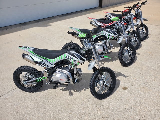 2025 SYX 125cc 4 stroke pit bike/dirt bike. Brand new, fully automatic (also have semi automatic 4 speed), hydraulic disc brakes front and rear, and electric start. These little bikes fire right up and run amazing. The perfect pit bike or for kids to learn how to ride. Fully auto, just hit the gas and go. Good torque/power. Rated up to 330lbs and comes with factory warranty. Will not find a cheaper well put together bike than these!