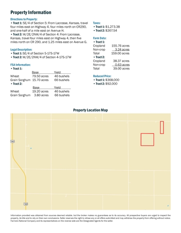 Property Location:SE/4 of Section 5-17S-17W-From Lacrosse, KS 4 miles east on Hwy 4, 4 miles north on CR290 and 1/2 mile east on Avenue H (Sale Pending on Tract #1);