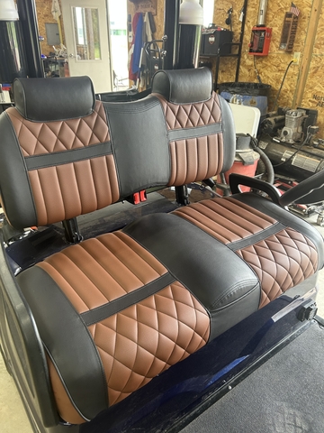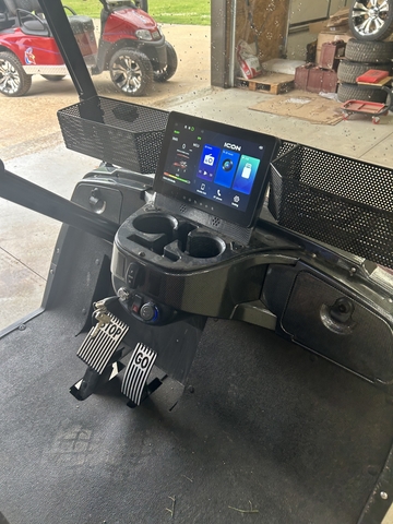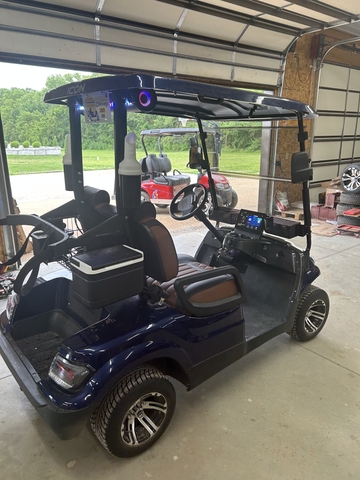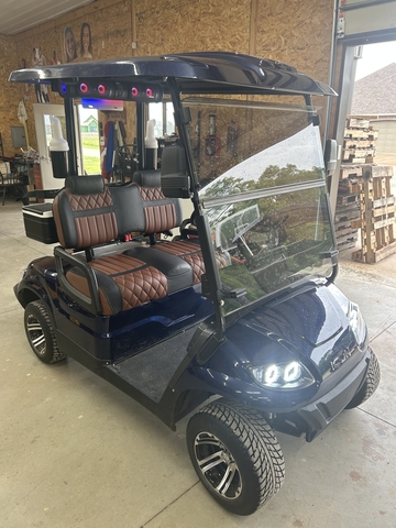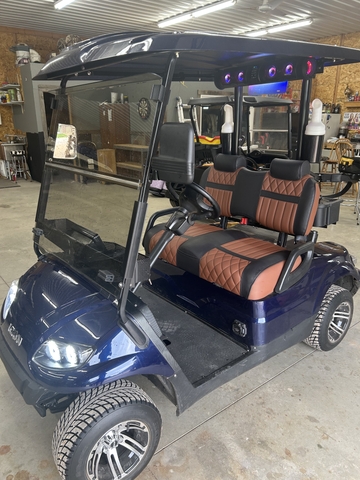LOOK GOLFERS! THE PERFECT GOLFING MACHINE. DARK BLUE ICON EV I20 GOLF CART. LAZY LIFE "COOL TOUCH" DELUXE BLACK/WHISKEY SEAT. 51 VOLT/105 AH ECO BATTERY LITHIUM BATTERY. 26" ECOXGEAR SOUNDEXTREME AMPLIFIED BLUETOOTH SOUNDBAR W/RGB LIGHTING. HEADLIGHTS, TAILLIGHTS, TURN SIGNALS, HORN, SEAT BELTS, DUAL COOLERS, SAND BOTTLES, DUAL USB, LOCKING GLOVE BOXES, ONBOARD CHARGER AND TINTED WINDSHIELD. GOLFERS DON'T MISS THIS ONE. READY TO GOLF. GIVE RON A CALL AT THREE ONE SIX 305 2445