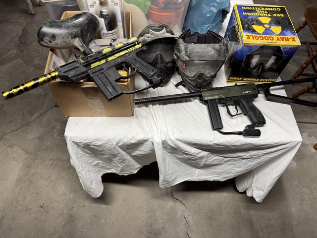 hoppers, ball caddy, paintballs, cleaning kit and barrel plug.