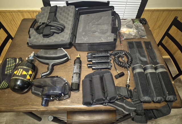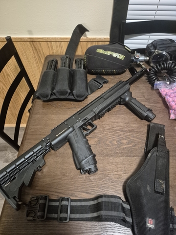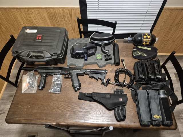 T9 tiberius convertible paintball over$ 1000 in paintball gun and accessories it was 500 .just for the gun 150 for the big tank 120 for the three mags I got alot in it but work construction and works slow so make an offer threeonesixtwofiveninetwosixzeroone