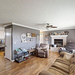 Living Room: 13’5” X 16’. Double-Sided Woodburning Fireplace with Gas Starter. Rock Front/Granite Hearth. Cleanout grate dumps in basement storage room. Carpet.