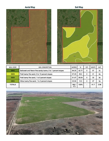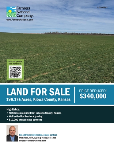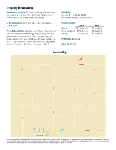 This property is located in northern Kiowa County, just northeast of Greensburg. It offers guaranteed income through a cash rent grazing and forage production lease that is effective until October 1, 2027. The buyer will receive cash rent payments on October 1, 2025, and October 1, 2026.