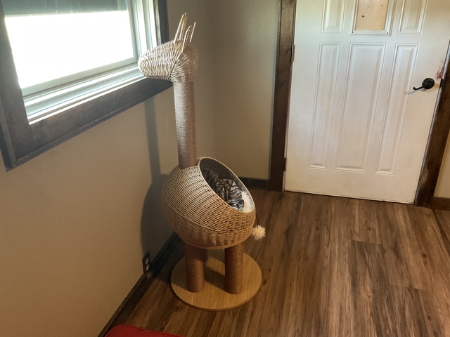 Barely used.....my cats do not like it. Paid $76.00 for it. It is a 51" wicker cat condo in the shape of a giraffe.