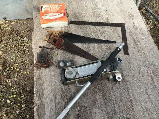 Items cleaned out of an old garage: tool belt, 73-87 GMC/chevy tail light lens, set of six new #86 spark plugs, staple gun and staples, bench mount riveter with several hundred brass rivets, gas can spout, pair of new wheel bearing protecters for a boat trailer, ounce measuring pressure guage, coors can openers, new stick on reflective tape for trailers, b/d weed trimmer lines, old porcelain insulator, R85394 oil filter, 33-2136 air filter, old union cardboard and metal can, ca303 fram air filter- fits v8 fords, two hand saws, framing square, pipe vise, amp/oil pressure gauges, aluminum floor jack. The jack works but release knob is broken, have to release it with a pair of pliers. All together for $15 cash.💰 No check, no delivery, no texts. Contact me here or at six20792549eight and keep trying. Click on my name (top left corner) for other old items.