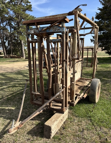This is a WW cattle squeeze chute with an added on KW Head Gate. This can be converted back to just the original WW chute. This is an older unit but has been shedded the past several years. The tires are not very good. Cross posted.Call for further information. Will not reply to text messages. (785) 658-5779