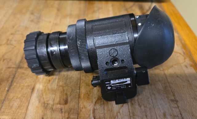 Selling my nods, its an IIT 6010 housing with a gen3 Omni IV tube, shows its age but is still very much serviceable/useable. Primarily used this unit for astrophotography, but occasionally would go shooting/hunting with it. No battery corrosion damage anywhere internally, Ive always used Energizer lithum ion (NOT alkaline) AA's in this thing. Attached pics are of the unit itself as well as looking into a pitch black (cant see your hand in front of you) room, and a pic from the other night after sundown/around 10pm with a IR handheld beam illuminating the area.