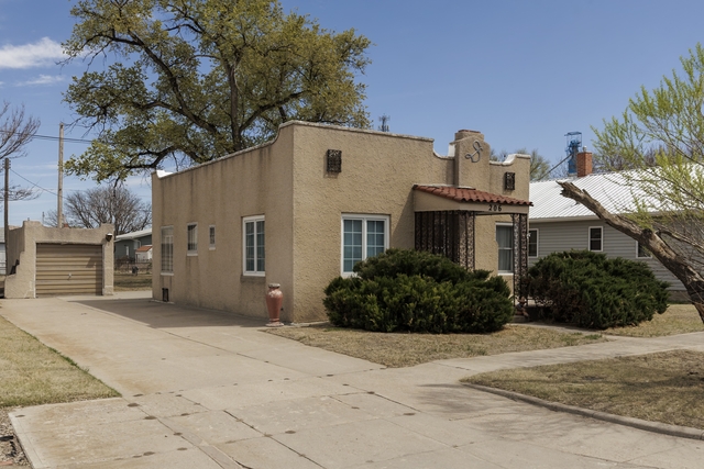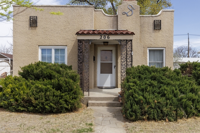 This is a cute bungalow with Spanish style architecture. It has two bedrooms, one bath, kitchen, large living room, and a breakfast nook on the main floor. The interior walls in the living room are plaster with arched doorways mirroring the Spanish architecture of the exterior. The breakfast nook has built-in wraparound seating.