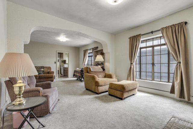 LIVING ROOM: 24’7” X 12’11”. Electric fireplace, iron-paned windows, plaster arches mirroring Spanish style architecture.