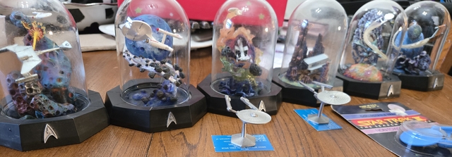 these are 6 scenes form the TV Start Trek, they ar fom the 1990s. They have never been played with and have been in a display case with their domes on. None of the domes are cracked or chiped. We brought them for $25 a piece. The 2 small ship are the diffent style of the enterprise. The picturess are not workimg well with our computer I can snd them to your phone if you wish.Please pick up in hays as they are heavey and in a large enoutgh box to cost about 420 to send