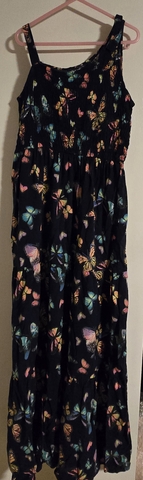Dress is dark blue with butterflies.
