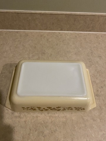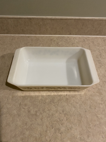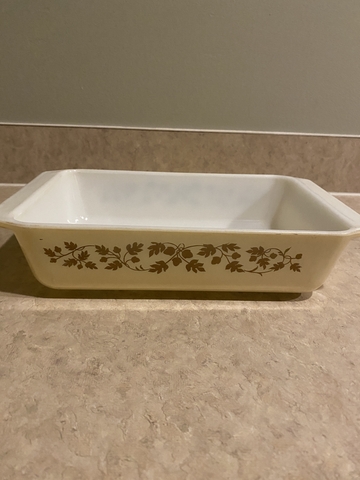 Pyrex baking dish 2 quart. Inside measures approx. 9 1/2" x 6 1/2". Gold foil leaf design on the sides. Not able to use in microwave.