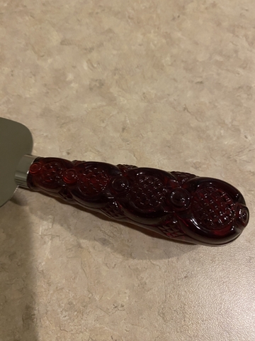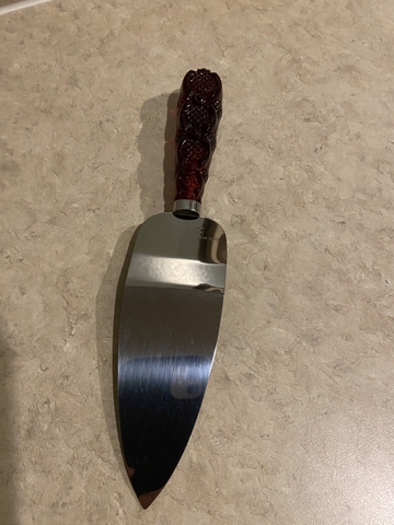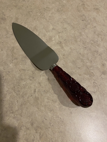The server is in excellent condition and has a serrated edge on one side with a ruby red handle. Box states it is dishwasher safe.