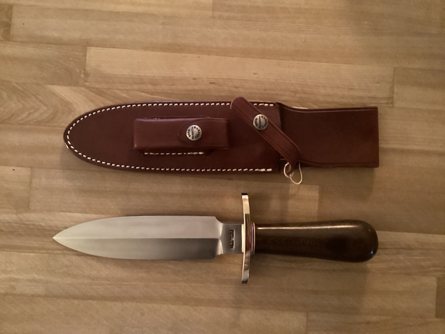 Tom Clinton special model. Brass guard with brown micarta handle.