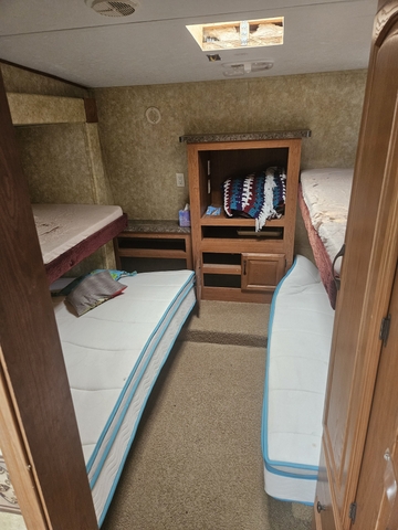 2008 Sierra Forest River 345QB. We bought it in early 2020 and the only reason we are selling it is we bought a cabin. It leaked water in both back corners when we got it but have had those successfully sealed since. It has three slide outs. Installed an on-demand water heater in 2023 and new 14 ply tires last year. New full size and one twin mattress in bunk room in 2021. Resealed the roof in 2021. There is no awning. All new roof vent covers last fall. It has the goosenck ball hookup. Brand new vinyl floor installed 6 months ago.Everything else works it is a solid camper. 308-340-6286