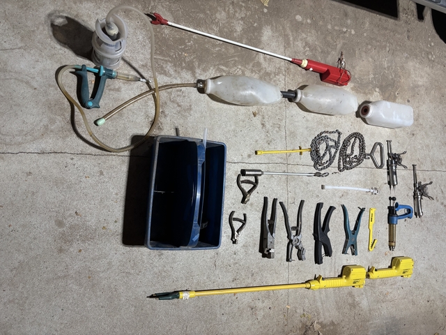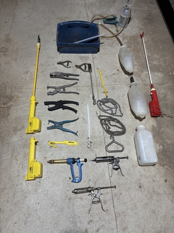 Cattle prods, ear tagers, syringes long range dispenser w/500 mi bottle 1/4 ful