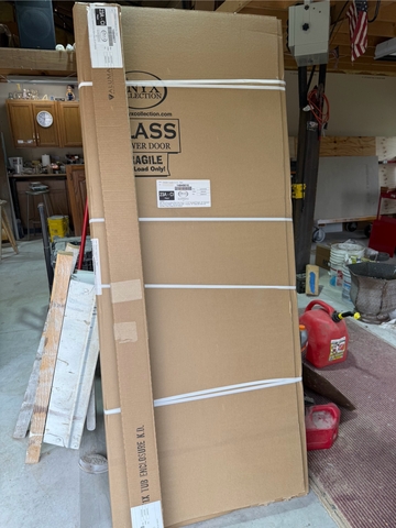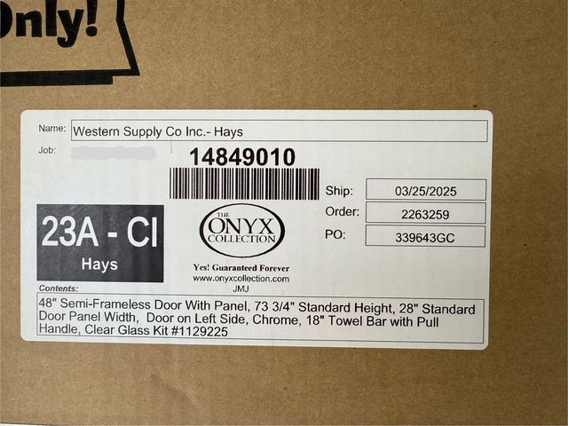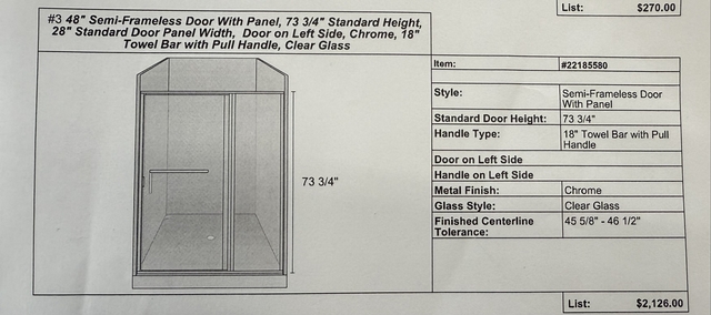 New in box Onyx brand 48" x 73 3/4" glass shower door. Semi-frameless door with side panel. 28" door on left hand side. Chrome hardware with 18" towel bar and pull handle. Clear glass.
