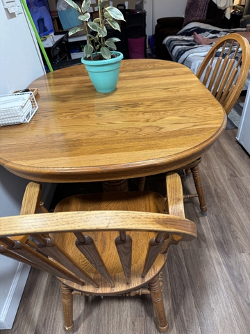 Solid oak table in great shape includes four leaves and a turntable to match.