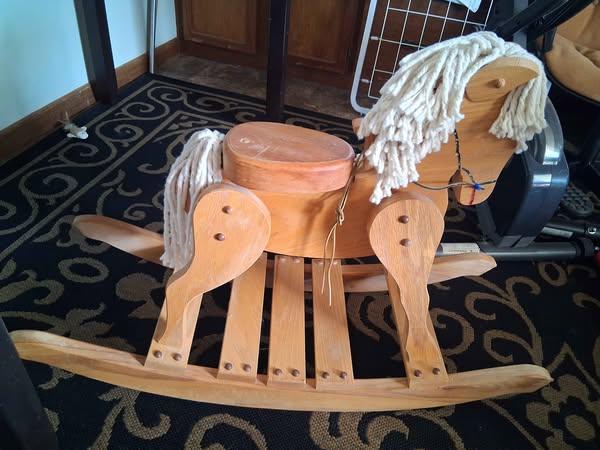 I have for sale a child's homemade rocking horse made by a local craftsman. It does have a couple spots where my moms dog chewed on it. Located in Victoria ks.