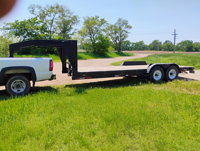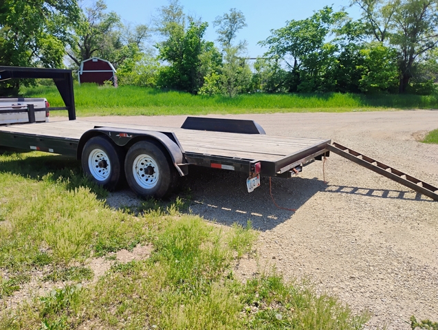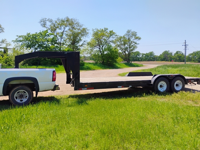 20 lg X 7 wd GOOSE NECK TRAILER FLAT DECK two axles , 8 bolt hubs, two heavy duty ramps , single heavy duty jack, good floor. Sticker on inside of neck barely shows W W trailer. contact MAX at 785-479-6378, keep calling sometimes cell reception goes in and out. NO TEXTS, PRICE $6500.00