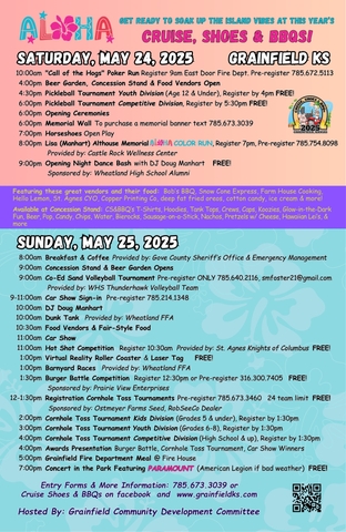 Plus, don't forget to refuel with a delicious meal provided by the Grainfield Fire Department at the Fire House from 5–8pm on Sunday.