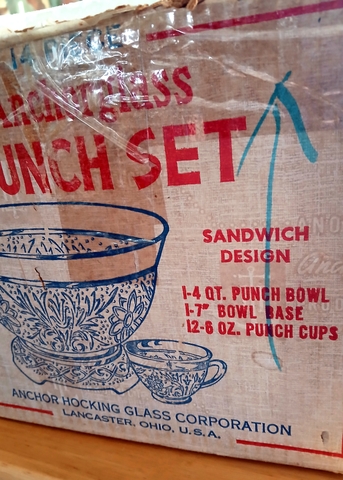 Anchor Hocking Sandwich Punch Set. Made in USA. 4 QT punch bowl, base and 12- 8oz cups. Pick up in Norton. PM me if interested. Cash only.
