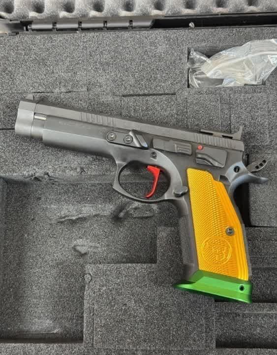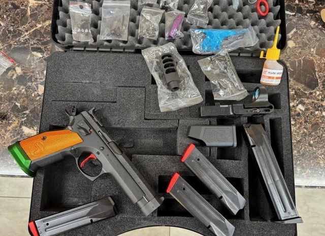 THIS IS A SLIGHTLY USED CZ 75 CZECHMATE PARROT 9MM LUGER KIT IN FACTORY CASE. SEEMS TO BE COMPLETE, WITH C MORE RED DOT, MOUNT, COMP, 4 TOTAL MAGS, ACCESORIES MOUNTING SCREWS ETC IN FACTORY CASE.