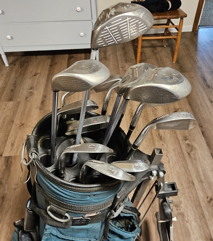 Complete set of golf clubs, bag, golf balls, tees and markers. Great for a beginer golfer wanting a good set of clubs.