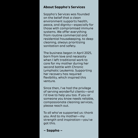 Sappho’s Services is built on the idea that a clean home is more than just a luxury — it’s a foundation for health, peace, and well-being. I have an appreciation for how essential a clean, sanitized environment is — specifically for those with compromised immune systems. A dust-free, germ-conscious home isn’t just about appearance; it’s about safety, healing, and dignity.
