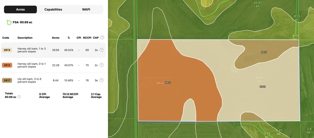 The property consists of 81 +/- total acres, 78 farmable acres. 90 percent of the land consists of good quality, class II soils.