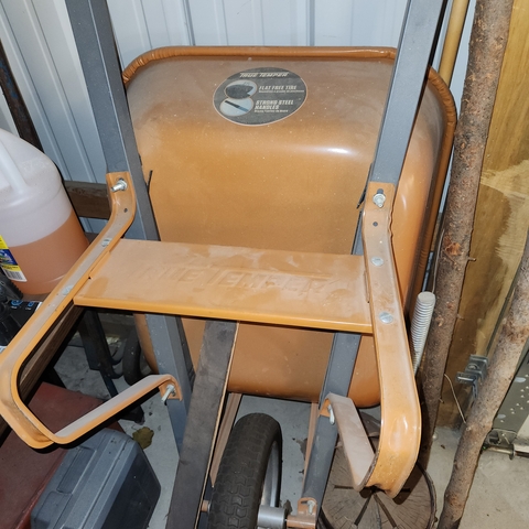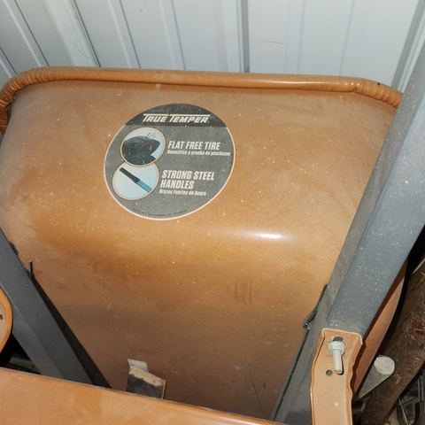 True Temper wheelbarrow. Flat free tires and steel handles. Nothing wrong with it, as it not been used a lot.