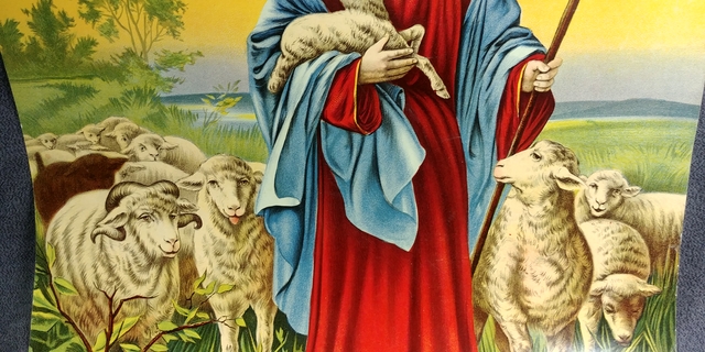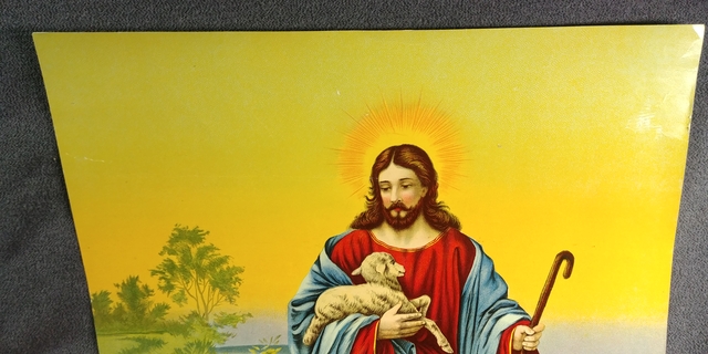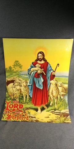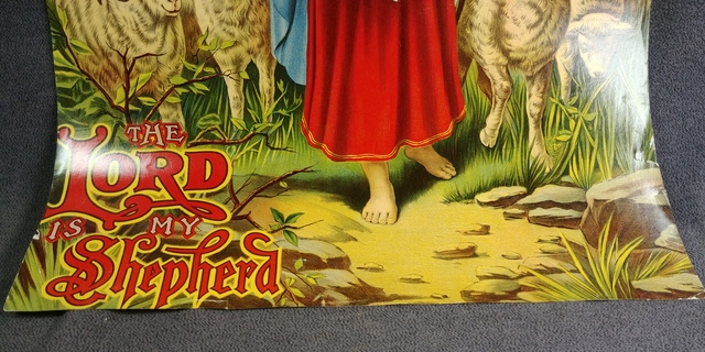 A circa 1900's litho poster print of Psalm 23 The Lord is My Shepherd with bright colors featuring Jesus as the Shepherd.