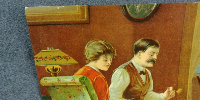 A circa 1900's litho poster print of a Home Sweet Home family with mother knitting, father smoking his corn cob pilpe, daughter with her doll and baby boy with toy horse and drum by the dog near fire place