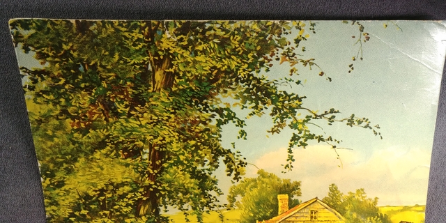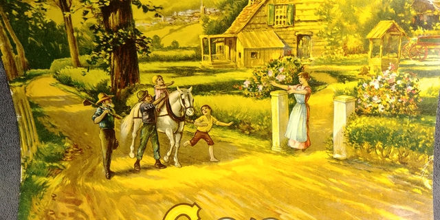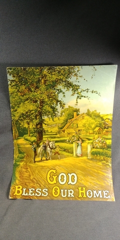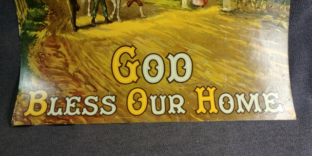 A circa 1900's litho poster print of a agriculture farm scene God Bless Our Home with mother welcoming family home.