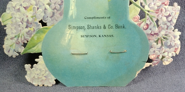 A circa 1920's die cut top for a calendar for Simpson Shanks & co Bank of Simpson Kansas in Cloud and Mitchell counties.