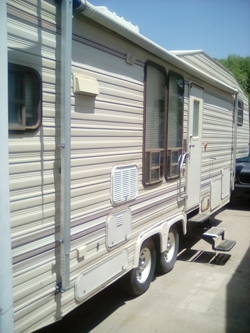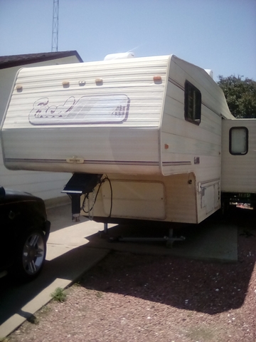 Time to get it out of my driveway. Roof needs attention. 24 foot Excel Fifth wheel camper. One slide out with table and couch that converts to a bed. Power landing gear. Queen size bed in main bedroom. Everthing worked the last time we used it. Awning is starting to tear and may need attention,but still works. Low mileage tires and lots of storage. Can send more pictures if needed. Call or message 785-6 two 7-6 zero 56. $1000 OBO